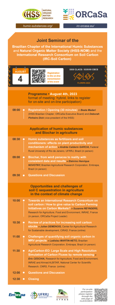 In parallel to the XXIII Latin American and XXXVIII Brazilian Congress of Soil Science, EMBRAPA, ORCaSa’s regional node for South America, is organising a joint seminar of the Brazilian Chapter of the International Humic Substances and Natural Organic Matter Society (IHSS-NOM) and the International Research Consortium on Soil Carbon.